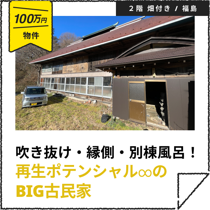 100均物件一覧 吹き抜け・縁側・別棟風呂!再生ポテンシャル∞のBIG古民家 2025.12.26 この物件を見る 【受付終了】山林付きじゃけえ!!広島の広々レトロ一軒家 2025.08.05 この物件を見る 【受付終了】建築不可でもイイんぢゃない??ポテンシャルありの100円空き地物件 2025.07.20 この物件を見る 【受付終了】宅地にも畑にも!?「やってみたい!」を詰め込める夢の空き地物件 2025.07.20 この物件を見る 【受付終了】ファミリーにおすすめ!大分のBIG倉庫付き5DK物件 2025.06.19 この物件を見る 【受付終了】これぞおさかな天国!?漁港近くのほどよい4K物件 2025.05.19 この物件を見る 次へ